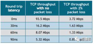 •丟包率為2%時,TCP吞吐量比無數據包丟失低6到25倍。